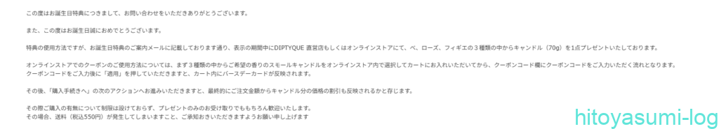 ディプティックHPでは【お誕生日限定特典メール受信条件】として