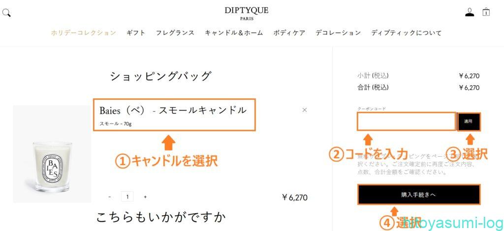 クーポンコード入力後「適用」を押すとカート内にバースデーカードが反映されます。 - その後「購入手続きへ」を選択すると注文金額からキャンドル分の価格の割引も反映される