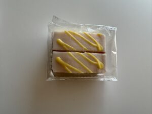上にアイシングが塗られていて、スポンジケーキの中にレモンクリームが挟まれています。